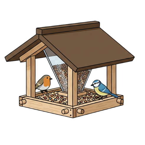 Fertigen Sie wettergeschützte Futterstellen (Futterhäuschen oder Futtersilos) aus robustem Holz, die eine hygienische Fütterung der Wildvögel ermöglichen.